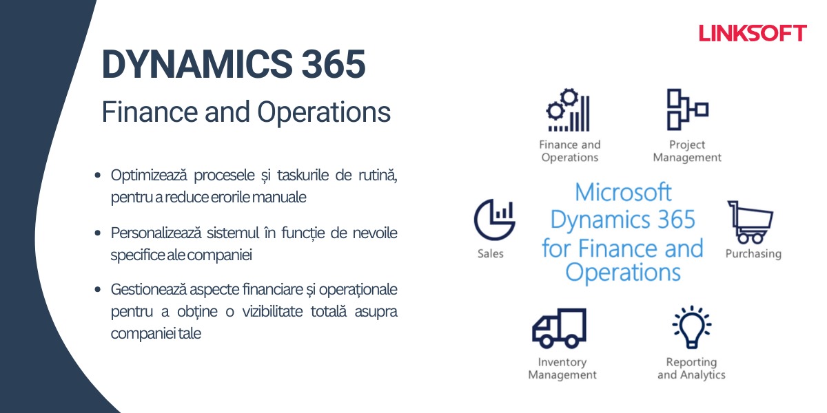 De ce Linksoft? – Linksoft este un partner de încredere Microsoft, care dispune de toate serviciile și capabilitățile necesare pentru a implementa Microsoft Dynamics 365 Finance și Operations. Un partner de încredere poate să-ți crească nivelul de productivitate și vânzări, îți îmbunătățește relațiile cu clienții, dar mai mult decât atât, te ajută cu servicii de consultanță, suport tehnic și training. Astfel, Linksoft oferă soluții practice pentru nevoile tale de business specifice și le aliniază cu cele mai înalte standarde actuale.