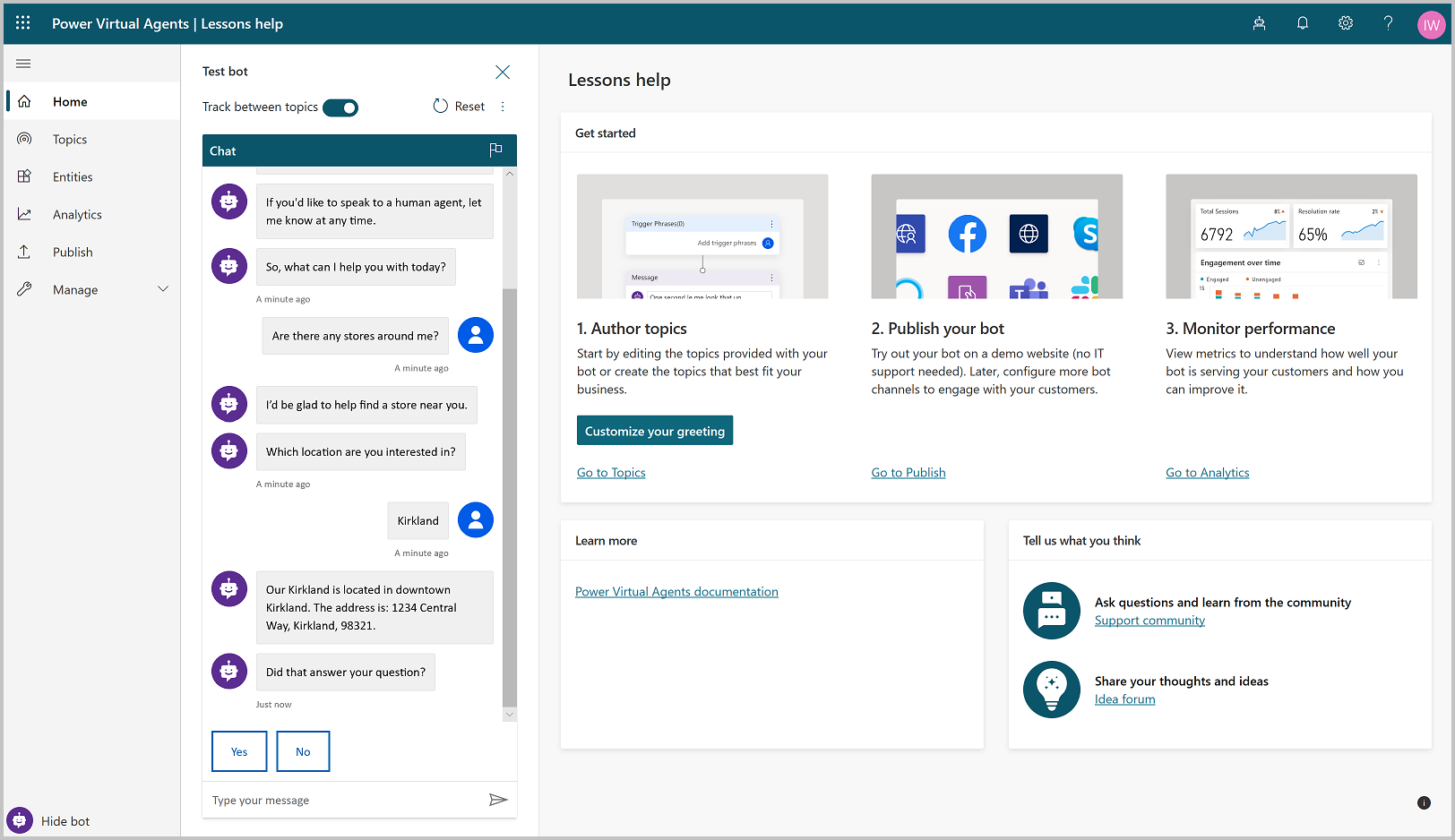- Natural Conversations– Use Microsoft’s powerful AI capabilities to enable users to have complex multi-turn conversations to guide them to the right solution without the need of training and retraining your own AI models.